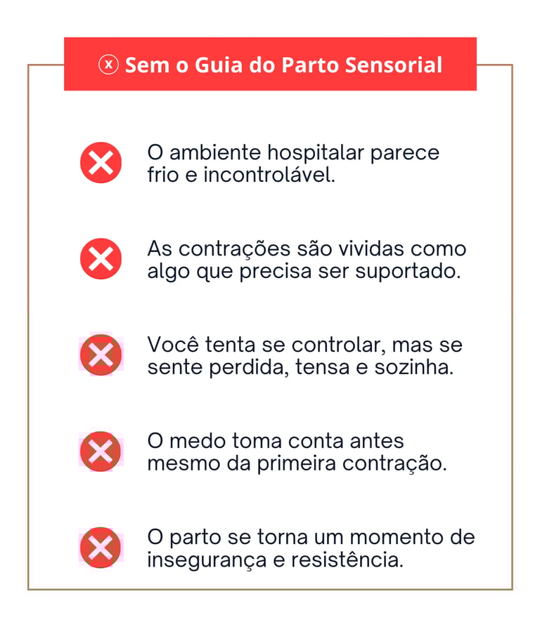 Com o Guia do Parto Sensorial, você vai descobrir como usar seus sentidos como aliados: o toque, o som, a luz e até os aromas podem estimular hormônios como a ocitocina e a endorfina, que reduzem a dor, acalmam a mente e aceleram o trabalho de parto.